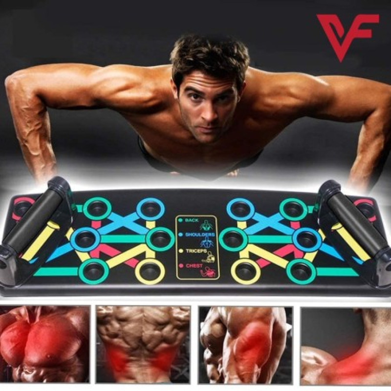 বিভিন্ন কালার-কোডেড পুশ আপ বোর্ড লক্ষ্য করে নির্দিষ্ট পেশী কাজ করেছে (নীল-বুক, লাল-কাঁধ, হলুদ-ব্যাক, এবং সবুজ-ট্রাইসেপস)